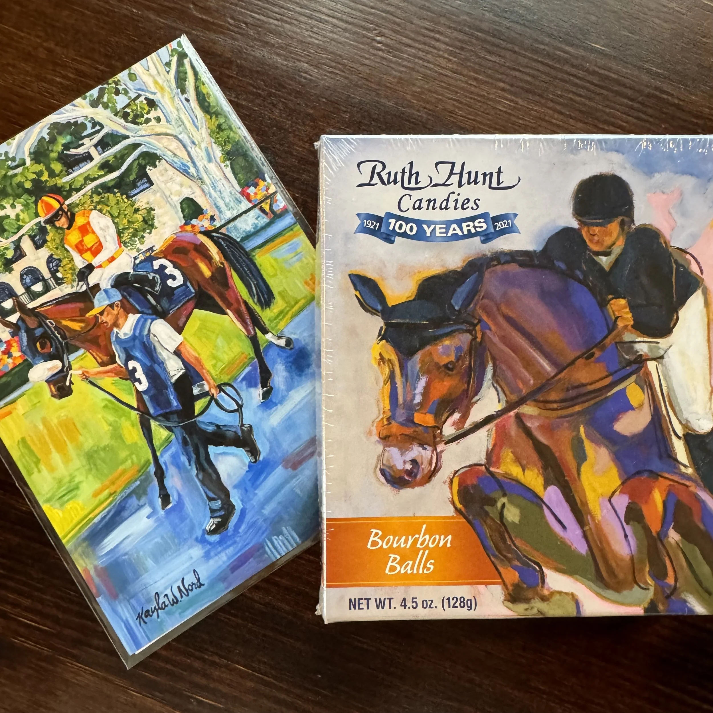 Featuring the colorful 'From Paddock to Purse' 5x7 art print and decadent Bourbon Balls, this gift box is perfect for celebrating the spirit of Kentucky.